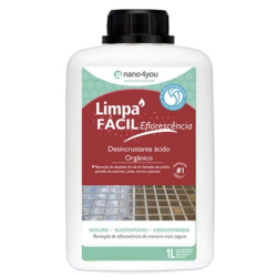 LIMPA FACIL EFLORESCENCIA 1L PRONTO USO ATIVO ACIDO ORGANICO - NANO4YOUO Limpa Fácil Eflorescência, é um poderoso decapante e eliminador de eflorescência manchas brancas e esbranquiçadas que estão em tijolos e pedras naturais. É Indicado para o tratamento de pedras naturais, superfícies minerais, revestimentos cerâmicos, cimentos e outros materiais porosos. Não possui necessidade de neutralização após a aplicação. O produto não é agressivo para o usuário e meio ambiente, e preserva as superfícies desejadas, além de retirar toda a eflorescência renovando a superfície. Benefícios: Remove radicalmente eflorescências - Elimina depósitos brancos formados pela ação do tempo. Seguro para superfícies frágeis - Não agride metais, vidros, borrachas e tintas esmaltadas. Pronto para uso - Não necessita diluição nem neutralização. Tecnologia Nano4you - Fórmula inovadora e sustentável, livre de ácidos agressivos. Versatilidade de aplicação - Ideal para concreto, argamassa, pedras, cerâmicas e mais. Aplicações Superfícies indicadas: Concreto e argamassa; Pedras naturais; Revestimentos cerâmicos; Telhas e tijolos; Paredes e superfícies minerais porosas. Ambientes: Internos e externos; Residenciais, comerciais e industriais. Modo de Uso Agite bem antes de usar; Aplique o produto puro, utilizando pulverizador de baixa pressão manual, rolo ou despejando diretamente na superfície; Deixe agir por até 3 minutos; Se necessário, utilize uma escova ou vassoura de cerdas rígidas para potencializar a ação; Enxágue completamente com jato de água ou lavadora de alta pressão; Repita o processo se a eflorescência for muito intensa ou persistente. Realize um teste preliminar na superfície. Importante: Não deixar o produto secar na superfície antes do enxágue; Evite aplicar em dias de chuva ou quando a temperatura estiver abaixo de 5ºC ou acima de 30ºC; Nunca aplicar sobre superfícies de alto brilho como mármore e pedras polidas. Características do Produto Fórmula inovadora - Livre de ácidos corrosivos, segura e eficaz; Preserva superfícies - Ideal para materiais sensíveis; Pronto para uso - Não requer diluição e nem neutralização; Tecnologia Nano4you - Alta eficiência e respeito ao meio ambiente
